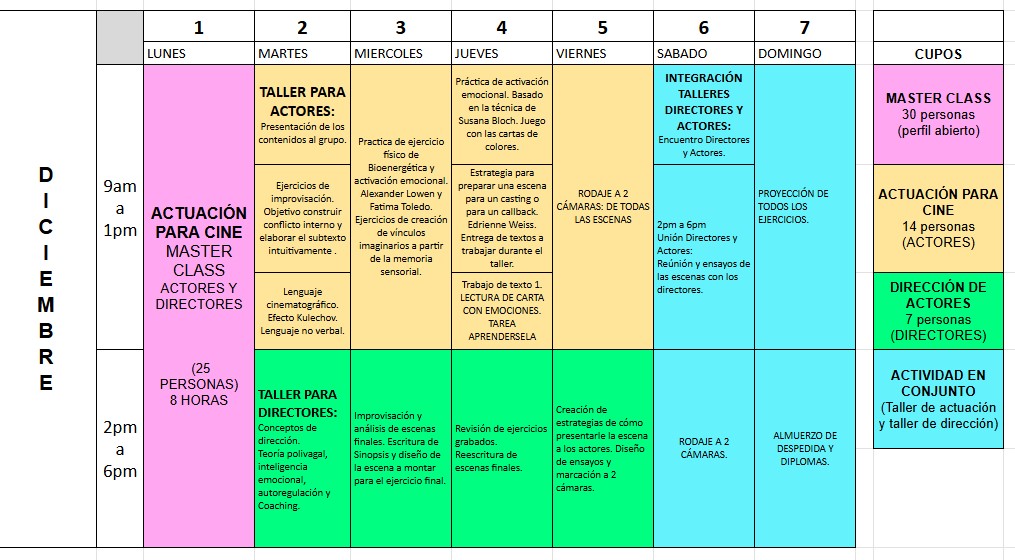 Activaciones emocionales con las herramientas de susana bloch. Conducta vs construcción de personaje. Subtexto a travéz del lenguaje no verbal. Lenguaje emocional y neuronas espejo. Cierre de procesos al final del día de grabacion. Ética y cuidado emocional.